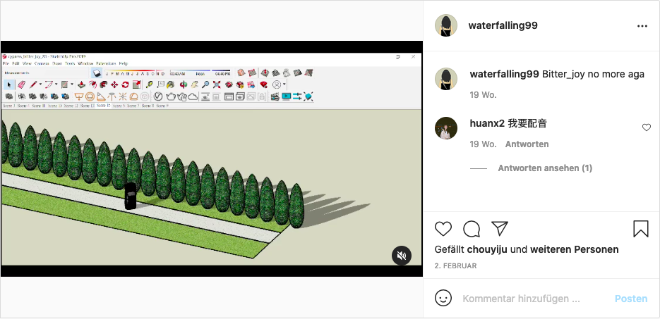 F: We’ve talked about the model within a theatre production process. Now I would also like to talk with you about some works where the model itself becomes the art. You’ve sent me some works by Ying-Chu Wu, a friend of yours. She also uses SketchUp to build models which she shows on her instagram.